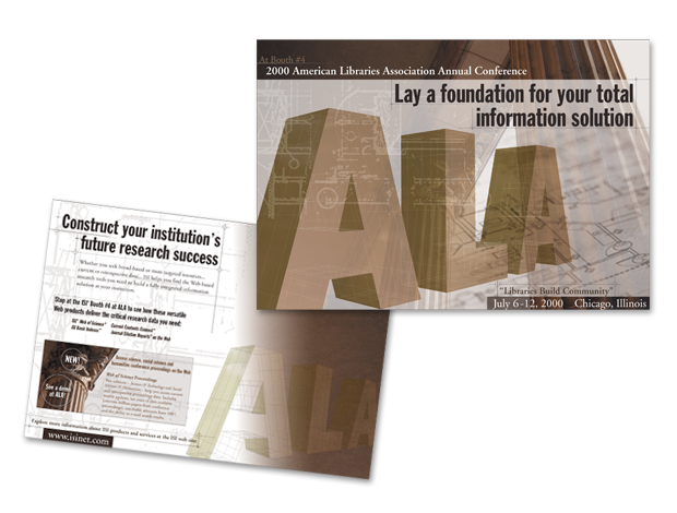 | Description | ISI's presence at the 2000 American Libraries Association Annual Conference Variety of Direct Mailers for Thomson Scientific's products, seminars, shows and events. Thomson ISI's head office was located in Philadelphia, PA, USA. |