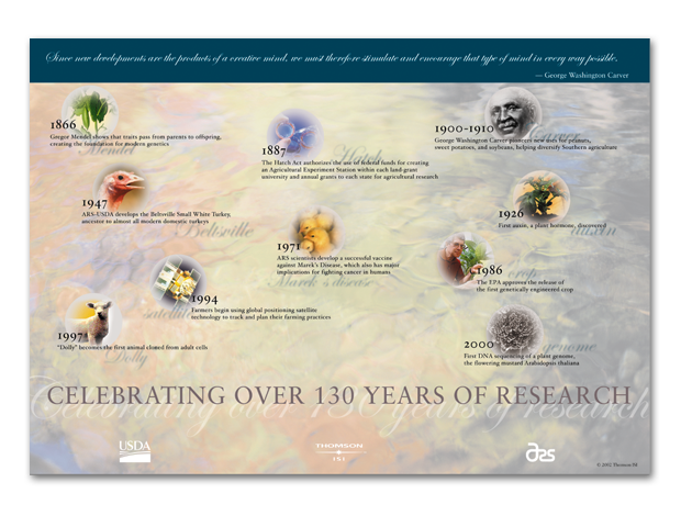 | Solution | An elegantly designed 6 color process 33" x 47" token poster presented by Thomson ISI to all attendees of a grand celebratory event commemorating the United States Department of Agriculture's achievements of over 140 years of research. Visually, the design goal was to create an elegant and timeless piece highlighting some major milestones and events which contributed to achievements in agricultural-related research-somewhat an artistic take on a timeline. |