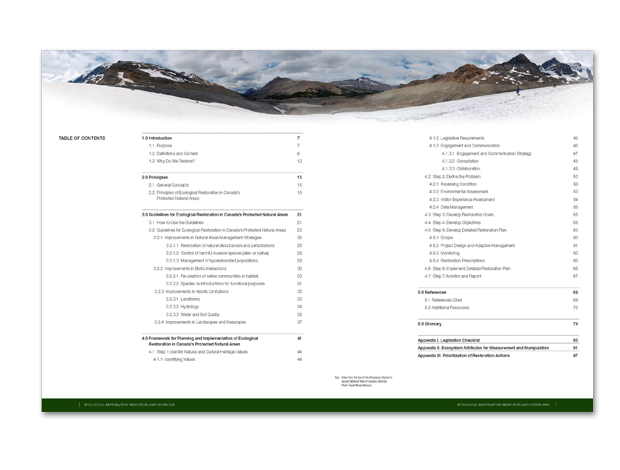 Description Publication design and layout for the presentation of the Principles and Guidelines for Ecological Restoration in Canada's Protected Natural Areas report.