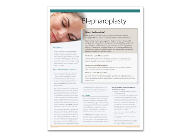 Description A customizable information package containing Fact Sheets with information on minor and/or major operative procedures for patients seeking facial reconstructive and cosmetic surgery.